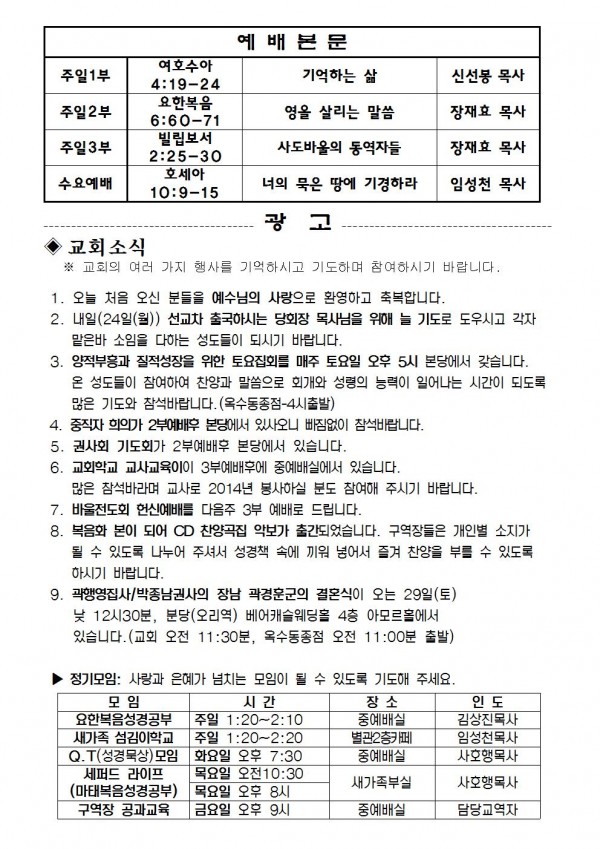 2013년 6월 23일 예배본문 & 교회소식 페이지 정보 작성자 최고관리자 작성일13-06-21 12:06 조회10,311회 관련링크 이전글 다음글 목록 본문 2013년 6월 23일 예배본문 & 교회소식 이전글 다음글 목록