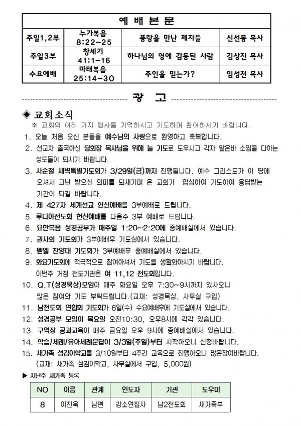 2013년 3월 3일 예배본문 & 교회소식 페이지 정보 작성자 최고관리자 작성일13-03-01 10:10 조회11,321회 관련링크 이전글 다음글 목록 본문 2013년 3월 3일 예배본문 & 교회소식 이전글 다음글 목록