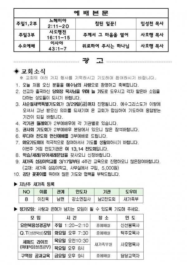 2013년 3월 10일 예배본문 & 교회소식 페이지 정보 작성자 최고관리자 작성일13-03-08 16:27 조회11,190회 관련링크 이전글 다음글 목록 본문 2013년 3월 10일 예배본문 & 교회소식 이전글 다음글 목록