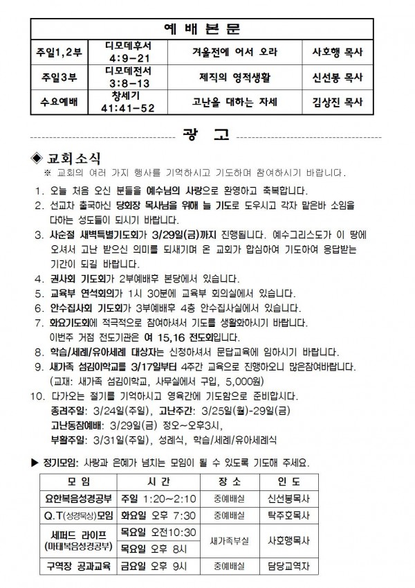 2013년 3월 17일 예배본문 & 교회소식 페이지 정보 작성자 최고관리자 작성일13-03-15 14:36 조회11,039회 관련링크 이전글 다음글 목록 본문 2013년 3월 17일 예배본문 & 교회소식 이전글 다음글 목록