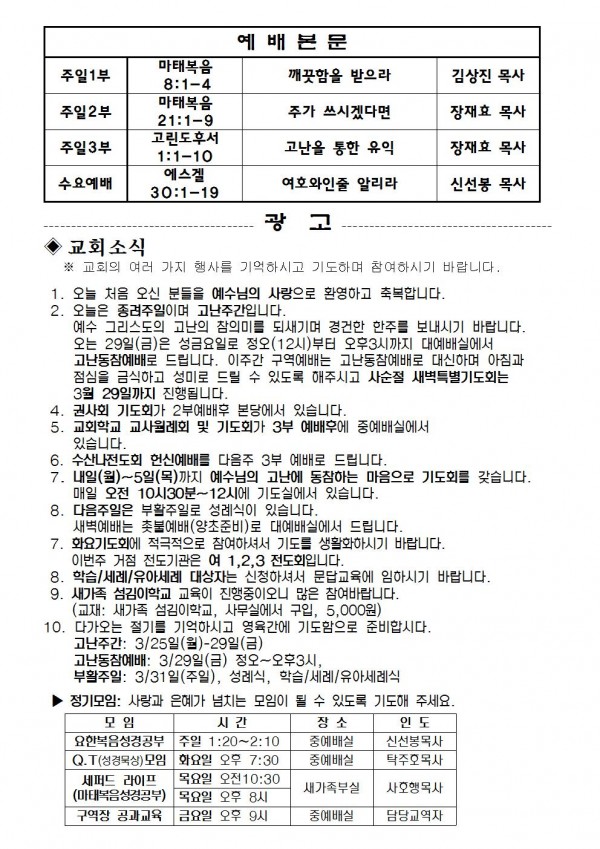 2013년 3월 24일 예배본문 & 교회소식 페이지 정보 작성자 최고관리자 작성일13-03-23 14:30 조회10,787회 관련링크 이전글 다음글 목록 본문 2013년 3월 24일 예배본문 & 교회소식 이전글 다음글 목록