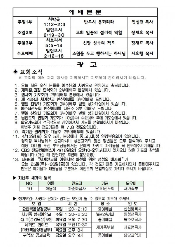 2013년 4월 7일 예배본문 & 교회소식 페이지 정보 작성자 최고관리자 작성일13-04-05 12:20 조회10,592회 관련링크 이전글 다음글 목록 본문 2013년 4월 7일 예배본문 & 교회소식 이전글 다음글 목록