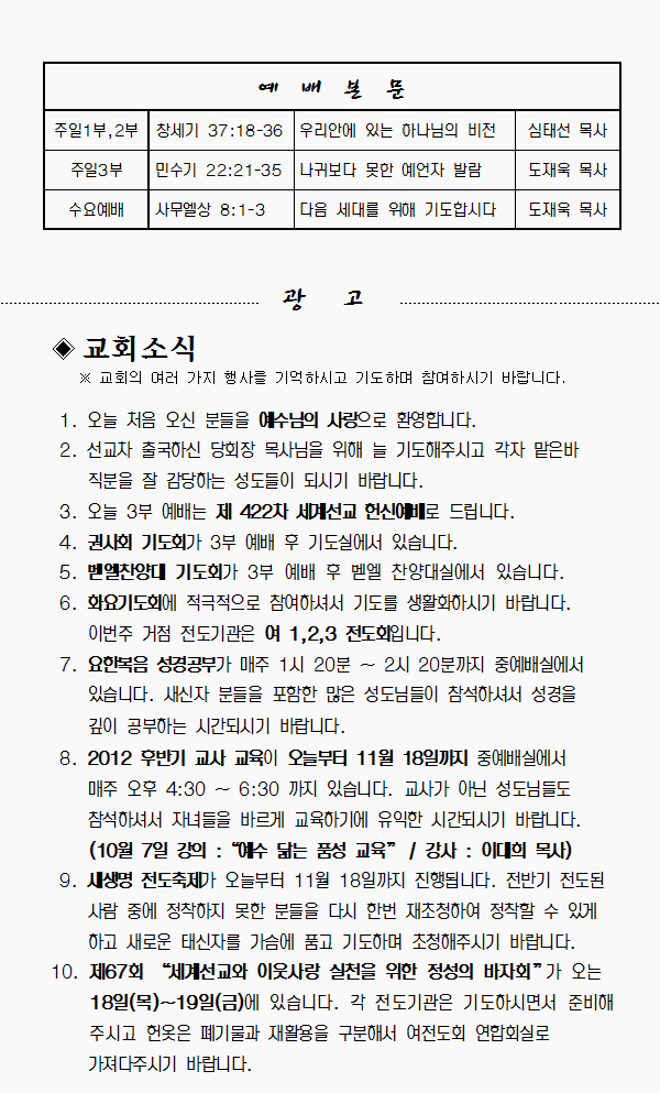 2012년 10월 7일 예배본문 & 교회소식 페이지 정보 작성자 최고관리자 작성일12-10-05 12:06 조회10,918회 관련링크 이전글 다음글 목록 본문 2012년 10월 7일 예배본문 & 교회소식 이전글 다음글 목록