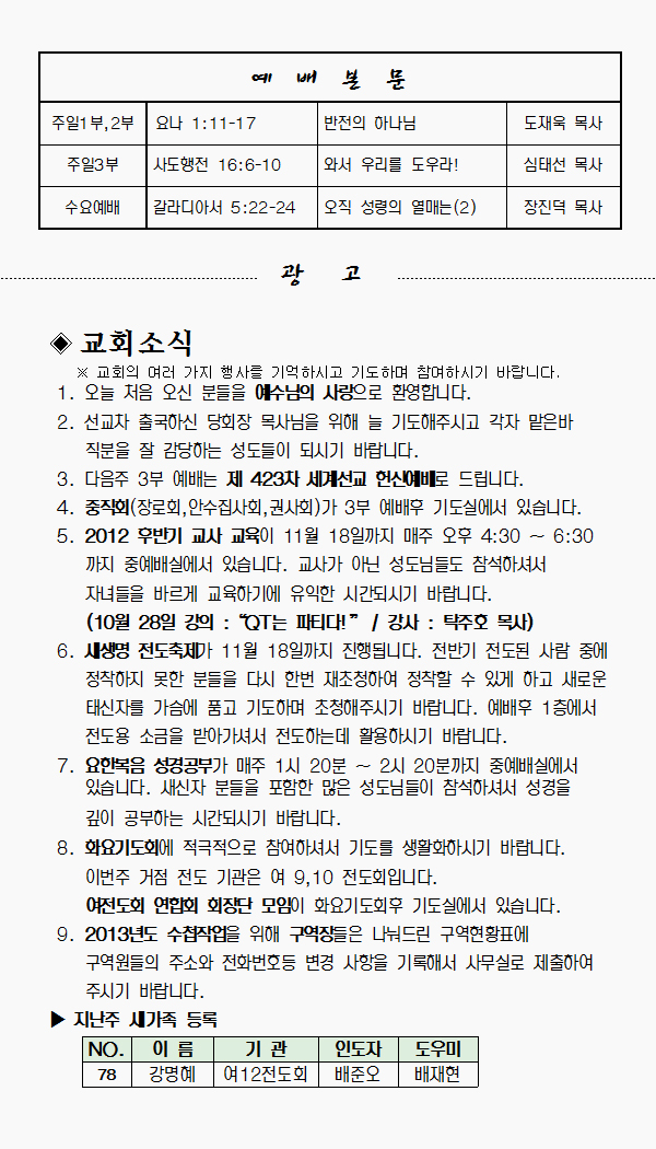 2012년 10월 28일 예배본문 & 교회소식 페이지 정보 작성자 최고관리자 작성일12-10-26 17:17 조회11,434회 관련링크 이전글 다음글 목록 본문 2012년 10월 28일 예배본문 & 교회소식 이전글 다음글 목록