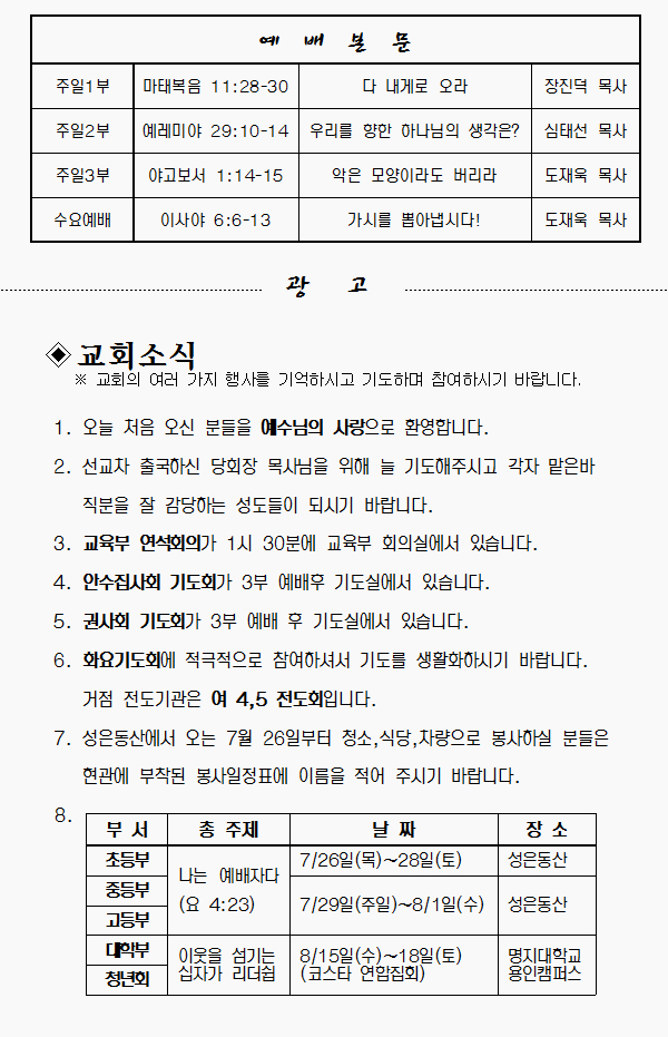 2012년 7월 15일 예배본문 & 교회소식 페이지 정보 작성자 최고관리자 작성일12-07-14 16:48 조회10,879회 관련링크 이전글 다음글 목록 본문 2012년 7월 15일 예배본문 & 교회소식 이전글 다음글 목록
