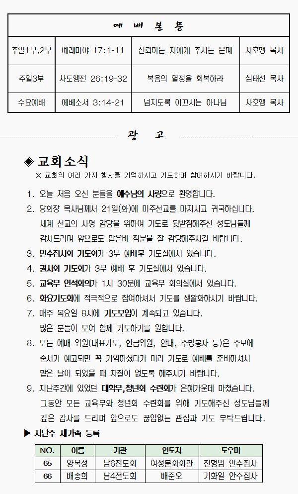 2012년 8월 19일 예배본문 & 교회소식 페이지 정보 작성자 최고관리자 작성일12-08-17 18:03 조회10,903회 관련링크 이전글 다음글 목록 본문 2012년 8월 19일 예배본문 & 교회소식 이전글 다음글 목록