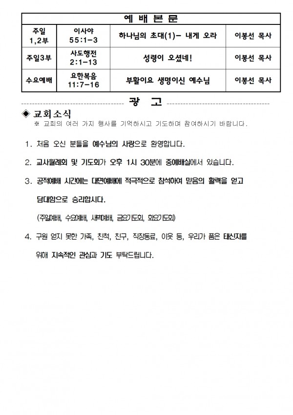 2024년 6월 23일 예배본문 & 교회소식 페이지 정보 작성자 성은교회 작성일24-06-21 14:59 조회4,368회 관련링크 이전글 다음글 목록 본문 2024년 6월 23일 예배본문 & 교회소식 이전글 다음글 목록