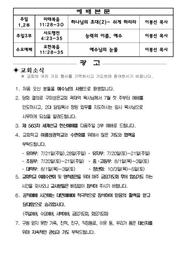 2024년 6월 30일 예배본문 & 교회소식 페이지 정보 작성자 성은교회 작성일24-06-28 16:57 조회4,426회 관련링크 이전글 다음글 목록 본문 2024년 6월 30일 예배본문 & 교회소식 이전글 다음글 목록