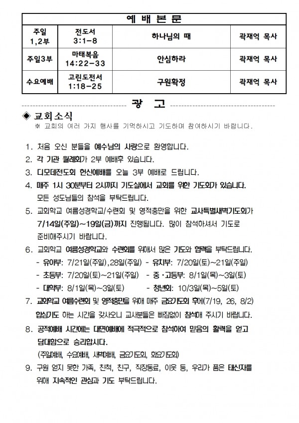 2024년 7월 14일 예배본문 & 교회소식 페이지 정보 작성자 성은교회 작성일24-07-12 16:17 조회4,229회 관련링크 이전글 다음글 목록 본문 2024년 7월 14일 예배본문 & 교회소식 이전글 다음글 목록