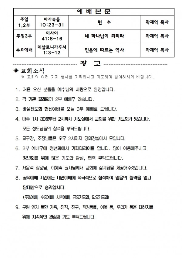 2024년 8월 11일 예배본문 & 교회소식 페이지 정보 작성자 성은교회 작성일24-08-09 15:47 조회4,036회 관련링크 이전글 다음글 목록 본문 2024년 8월 11일 예배본문 & 교회소식 이전글 다음글 목록