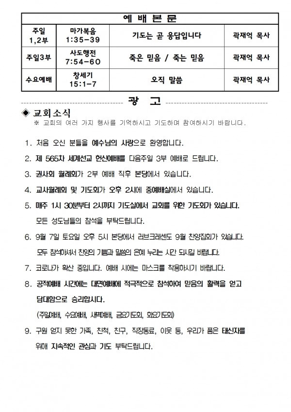 2024년 8월 25일 예배본문 & 교회소식 페이지 정보 작성자 성은교회 작성일24-08-23 16:56 조회3,946회 관련링크 이전글 다음글 목록 본문 2024년 8월 25일 예배본문 & 교회소식 이전글 다음글 목록