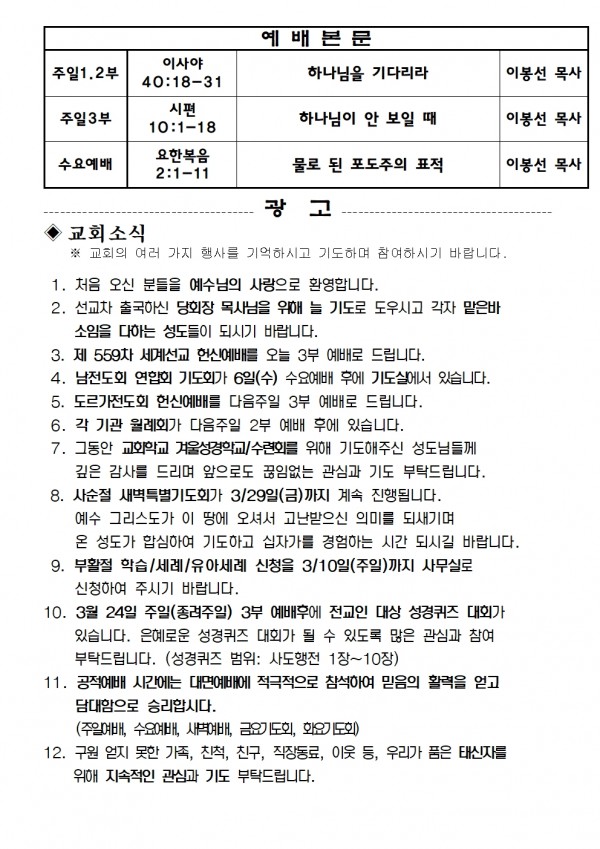 2024년 3월 3일 예배본문 & 교회소식 페이지 정보 작성자 성은교회 작성일24-03-02 10:14 조회4,439회 관련링크 이전글 다음글 목록 본문 2024년 3월 3일 예배본문 & 교회소식 이전글 다음글 목록