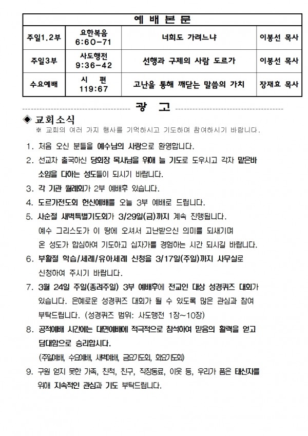 2024년 3월 10일 예배본문 & 교회소식 페이지 정보 작성자 성은교회 작성일24-03-08 11:47 조회4,447회 관련링크 이전글 다음글 목록 본문 2024년 3월 10일 예배본문 & 교회소식 이전글 다음글 목록