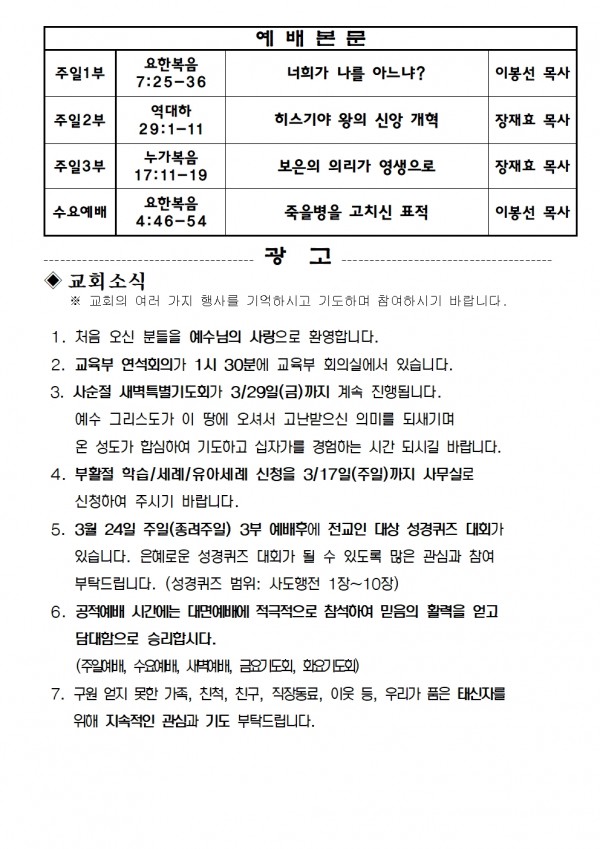 2024년 3월 17일 예배본문 & 교회소식 페이지 정보 작성자 성은교회 작성일24-03-15 11:31 조회4,447회 관련링크 이전글 다음글 목록 본문 2024년 3월 17일 예배본문 & 교회소식 이전글 다음글 목록