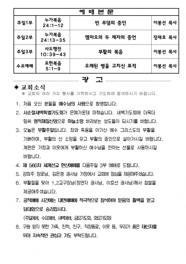 2024년 3월 31일 예배본문 & 교회소식 페이지 정보 작성자 성은교회 작성일24-03-29 12:55 조회4,452회 관련링크 이전글 다음글 목록 본문 2024년 3월 31일 예배본문 & 교회소식 이전글 다음글 목록