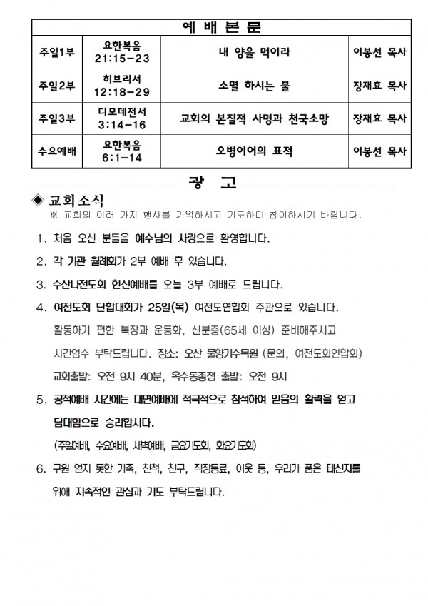 2024년 4월 14일 예배본문 & 교회소식 페이지 정보 작성자 성은교회 작성일24-04-13 12:01 조회4,488회 관련링크 이전글 다음글 목록 본문 2024년 4월 14일 예배본문 & 교회소식 이전글 다음글 목록