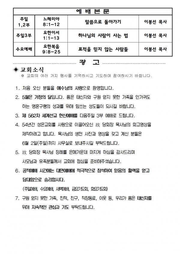 2024년 5월 26일 예배본문 & 교회소식 페이지 정보 작성자 성은교회 작성일24-05-24 11:49 조회4,413회 관련링크 이전글 다음글 목록 본문 2024년 5월 26일 예배본문 & 교회소식 이전글 다음글 목록