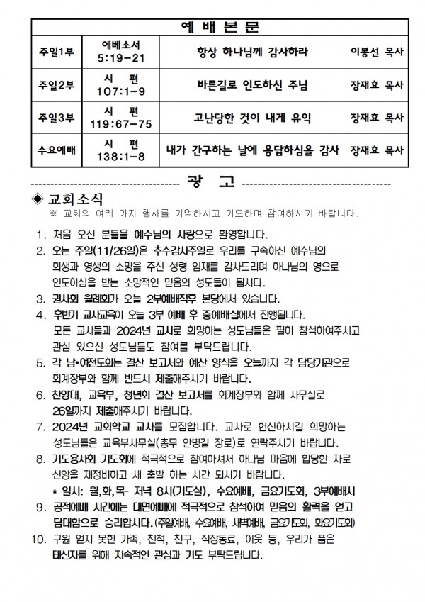 2023년 11월 19일 예배본문 & 교회소식 페이지 정보 작성자 성은교회 작성일23-11-17 17:00 조회4,598회 관련링크 이전글 다음글 목록 본문 2023년 11월 19일 예배본문 & 교회소식 이전글 다음글 목록