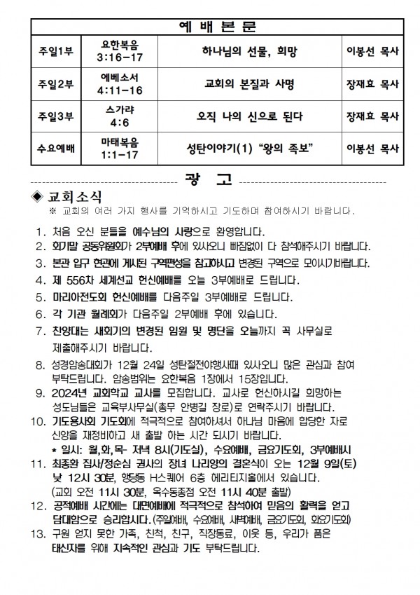 2023년 12월 3일 예배본문 & 교회소식 페이지 정보 작성자 성은교회 작성일23-12-01 18:24 조회4,615회 관련링크 이전글 다음글 목록 본문 2023년 12월 3일 예배본문 & 교회소식 이전글 다음글 목록