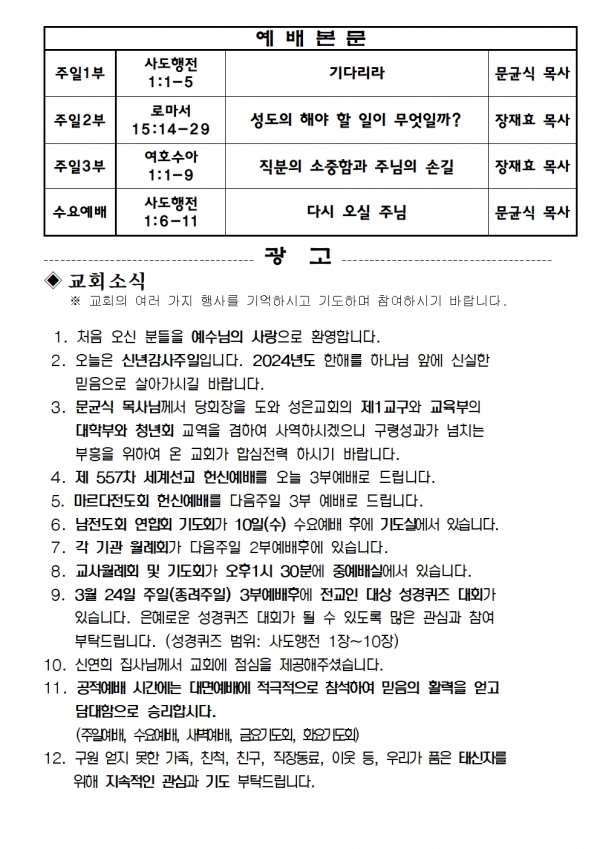 2024년 1월 7일 예배본문 & 교회소식 페이지 정보 작성자 성은교회 작성일24-01-05 13:49 조회4,556회 관련링크 이전글 다음글 목록 본문 2024년 1월 7일 예배본문 & 교회소식 이전글 다음글 목록