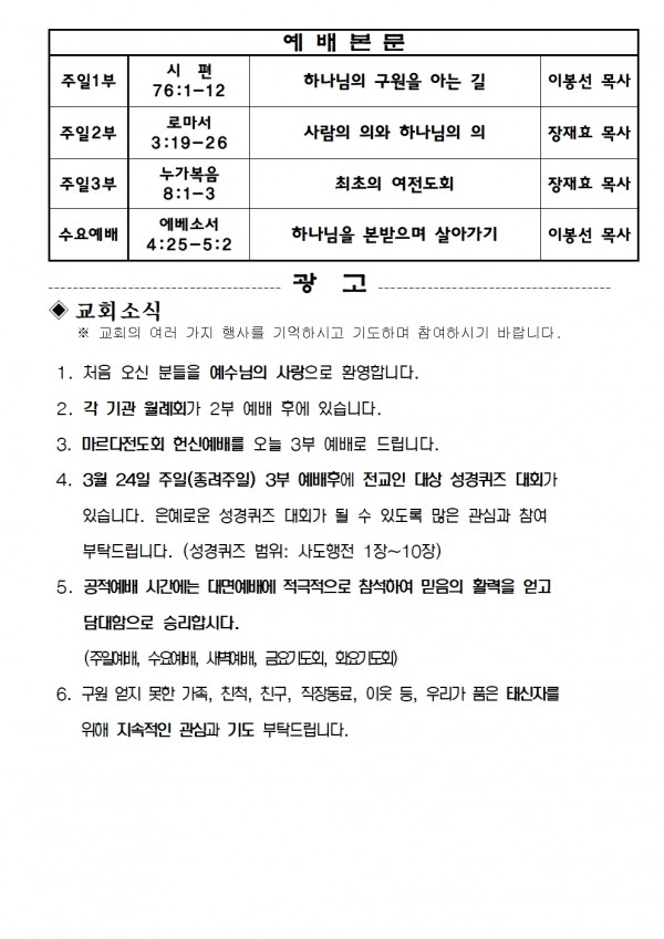 2024년 1월 14일 예배본문 & 교회소식 페이지 정보 작성자 성은교회 작성일24-01-12 13:59 조회4,487회 관련링크 이전글 다음글 목록 본문 2024년 1월 14일 예배본문 & 교회소식 이전글 다음글 목록