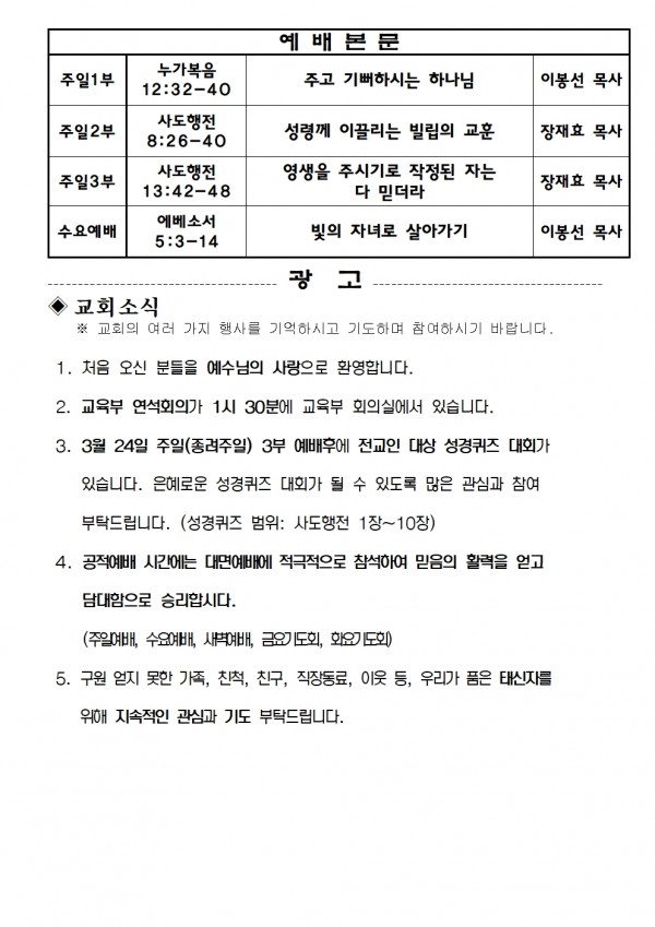 2024년 1월 21일 예배본문 & 교회소식 페이지 정보 작성자 성은교회 작성일24-01-19 16:02 조회4,509회 관련링크 이전글 다음글 목록 본문 2024년 1월 21일 예배본문 & 교회소식 이전글 다음글 목록