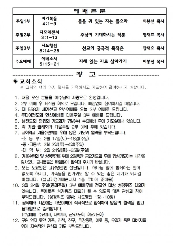 2024년 2월 4일 예배본문 & 교회소식 페이지 정보 작성자 성은교회 작성일24-02-02 15:49 조회4,500회 관련링크 이전글 다음글 목록 본문 2024년 2월 4일 예배본문 & 교회소식 이전글 다음글 목록