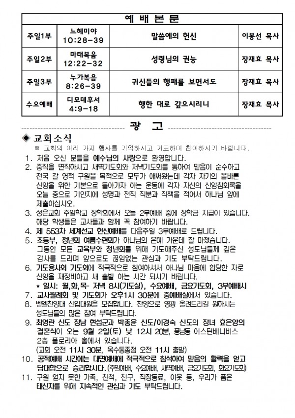 2023년 8월 27일 예배본문 & 교회소식 페이지 정보 작성자 성은교회 작성일23-08-25 19:36 조회4,875회 관련링크 이전글 다음글 목록 본문 2023년 8월 27일 예배본문 & 교회소식 이전글 다음글 목록