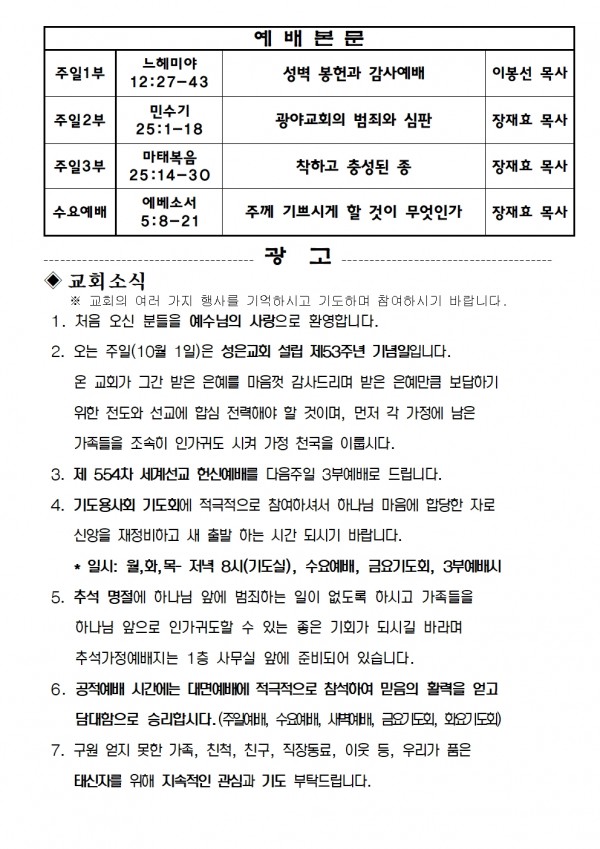 2023년 9월 24일 예배본문 & 교회소식 페이지 정보 작성자 성은교회 작성일23-09-22 19:55 조회4,712회 관련링크 이전글 다음글 목록 본문 2023년 9월 24일 예배본문 & 교회소식 이전글 다음글 목록