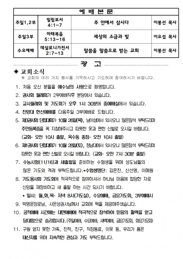 2023년 10월 22일 예배본문 & 교회소식 페이지 정보 작성자 성은교회 작성일23-10-20 16:53 조회4,643회 관련링크 이전글 다음글 목록 본문 2023년 10월 22일 예배본문 & 교회소식 이전글 다음글 목록