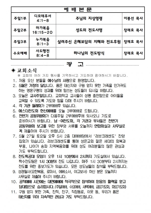 2023년 5월 14일 예배본문 & 교회소식 페이지 정보 작성자 성은교회 작성일23-05-19 11:16 조회5,067회 관련링크 이전글 다음글 목록 본문 2023년 5월 14일 예배본문 & 교회소식 이전글 다음글 목록