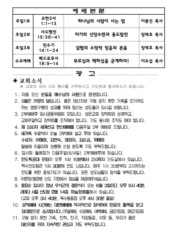 2023년 5월 28일 예배본문 & 교회소식 페이지 정보 작성자 성은교회 작성일23-05-26 16:30 조회5,140회 관련링크 이전글 다음글 목록 본문 2023년 5월 28일 예배본문 & 교회소식 이전글 다음글 목록