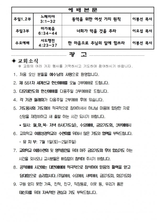 2023년 7월 2일 예배본문 & 교회소식 페이지 정보 작성자 성은교회 작성일23-06-30 16:59 조회4,964회 관련링크 이전글 다음글 목록 본문 2023년 7월 2일 예배본문 & 교회소식 이전글 다음글 목록