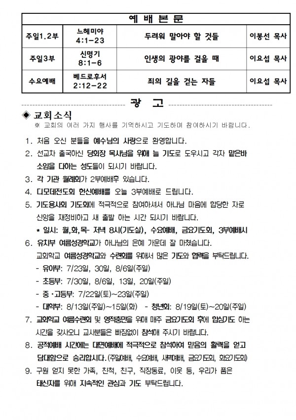 2023년 7월 9일 예배본문 & 교회소식 페이지 정보 작성자 성은교회 작성일23-07-07 11:32 조회4,900회 관련링크 이전글 다음글 목록 본문 2023년 7월 9일 예배본문 & 교회소식 이전글 다음글 목록