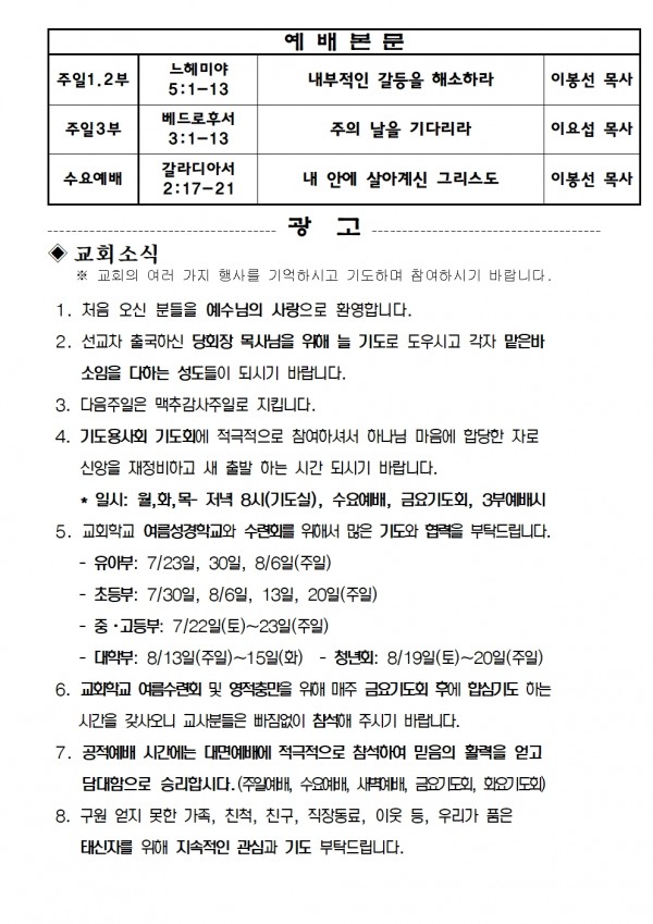 2023년 7월 16일 예배본문 & 교회소식 페이지 정보 작성자 성은교회 작성일23-07-14 14:09 조회4,965회 관련링크 이전글 다음글 목록 본문 2023년 7월 16일 예배본문 & 교회소식 이전글 다음글 목록