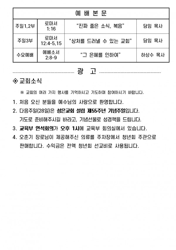 2025년 9월 21일 예배본문 & 교회소식 페이지 정보 작성자 성은교회 작성일25-09-19 17:05 조회2,077회 관련링크 이전글 다음글 목록 본문 2025년 9월 21일 예배본문 & 교회소식 이전글 다음글 목록