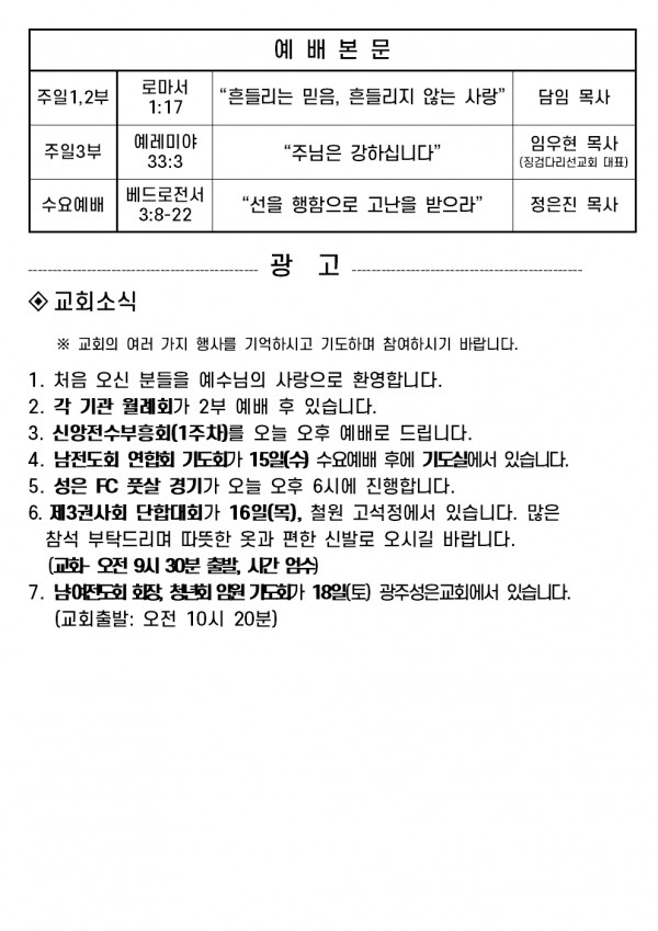 2025년 10월 12일 예배본문 & 교회소식 페이지 정보 작성자 성은교회 작성일25-10-10 17:28 조회1,963회 관련링크 이전글 다음글 목록 본문 2025년 10월 12일 예배본문 & 교회소식 이전글 다음글 목록
