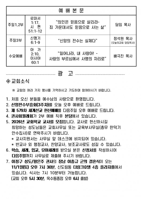 2025년 10월 26일 예배본문 & 교회소식 페이지 정보 작성자 성은교회 작성일25-10-24 14:36 조회1,541회 관련링크 이전글 다음글 목록 본문 2025년 10월 26일 예배본문 & 교회소식 이전글 다음글 목록