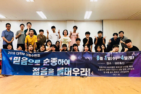 대학부입니다. 대학부 20-25세의 젊은 지체들로 예배는 토요일 오후 5시부터 찬양으로 시작 됩니다. 그리고 2부 순서로 마니또 뽑기, 가족모임(성경공부), 생일파티, 축복 나눔이 있습니다. 대학부는 가족중심으로 운영됩니다. 가족은 성경공부와 행사마다 함께 교제를 나누는 끈끈한 모임입니다.